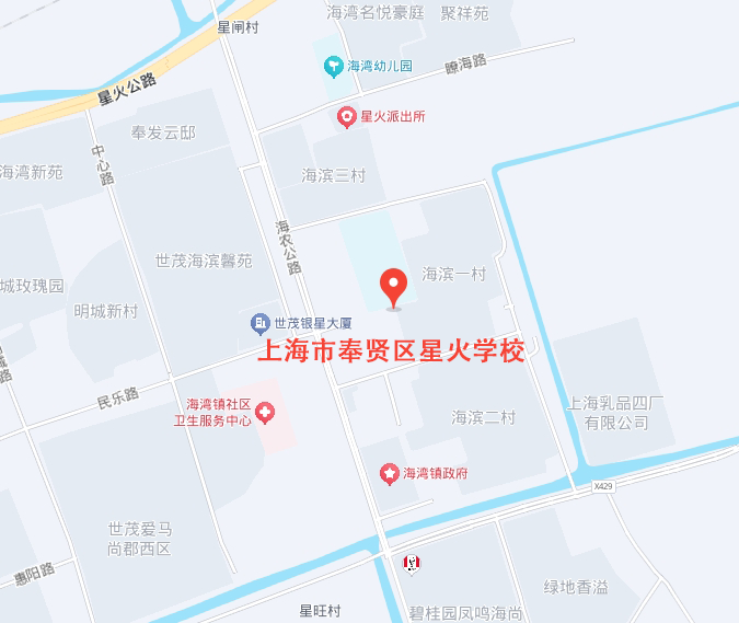 星火学校濒临美丽的杭州湾畔,座落于奉贤区海湾镇镇政府所在地,东临上海市农工商集团总公司、国家森林公园,西临星火开发区、海湾旅游区;学校是一所在2006年由企业办学转制为属地(奉贤区)管理的九年一贯制乡镇学校。它就矗立在幽静的星安路上,是一座花园式的校园。校园里绿树环抱,郁郁葱葱,一幢幢亮丽的红瓦红墙掩映其中。它有着近50年办学历史,传承着浓厚的农垦文化和农垦精神。学校建立于1965年,2006年转制属地,归属于奉贤区教育局。